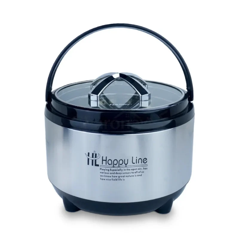 The Happy Line Glass Top Hotpot is a durable, insulated food server with a clear glass lid for easy viewing. Available at Gharona, H.526 Shahzad Plaza, College Road, Rawalpindi—perfect for everyday meals, parties, and gifting.