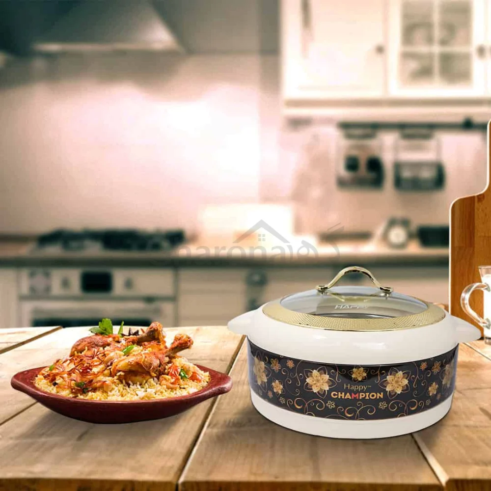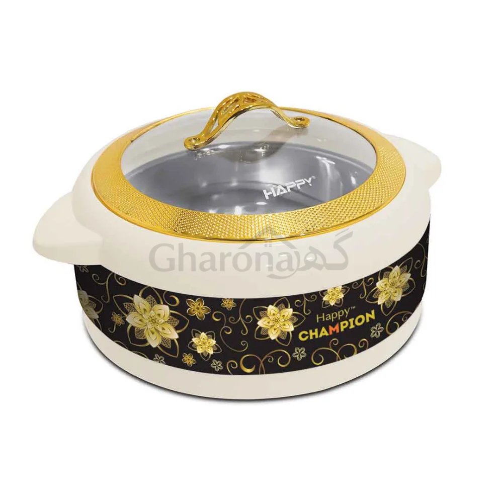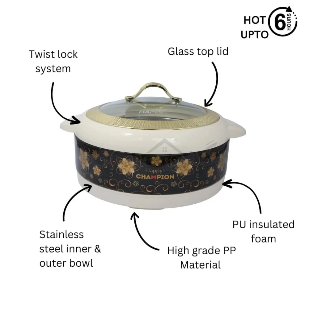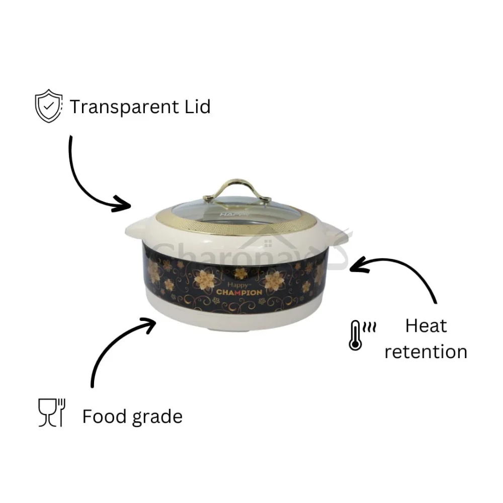 The Happy Champion Glass Top (Black) features premium insulation and a sleek glass lid to keep meals warm and fresh. Available at Gharona, H.526 Shahzad Plaza, College Road, Rawalpindi perfect for home use, gatherings, and gifting.