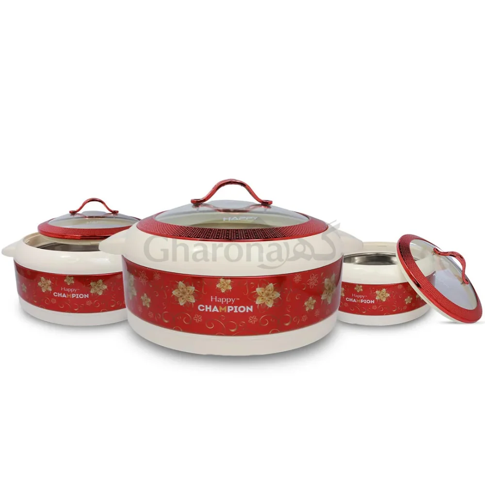 The Happy Champion Glass Top (Red) features premium insulation and a sleek glass lid to keep meals warm and fresh. Available at Gharona, H.526 Shahzad Plaza, College Road, Rawalpindi perfect for home use, gatherings, and gifting.