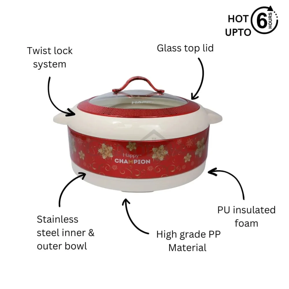 Serve your meals in style with the Happy Champion Glass Top (Red), available at Gharona – H.526 Shahzad Plaza, College Road, Rawalpindi. This sleek and durable hotpot is designed to keep your food warm and fresh for hours, making it perfect for daily family meals, gatherings, parties, and gifting.