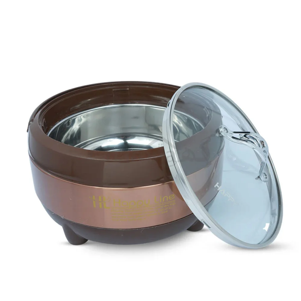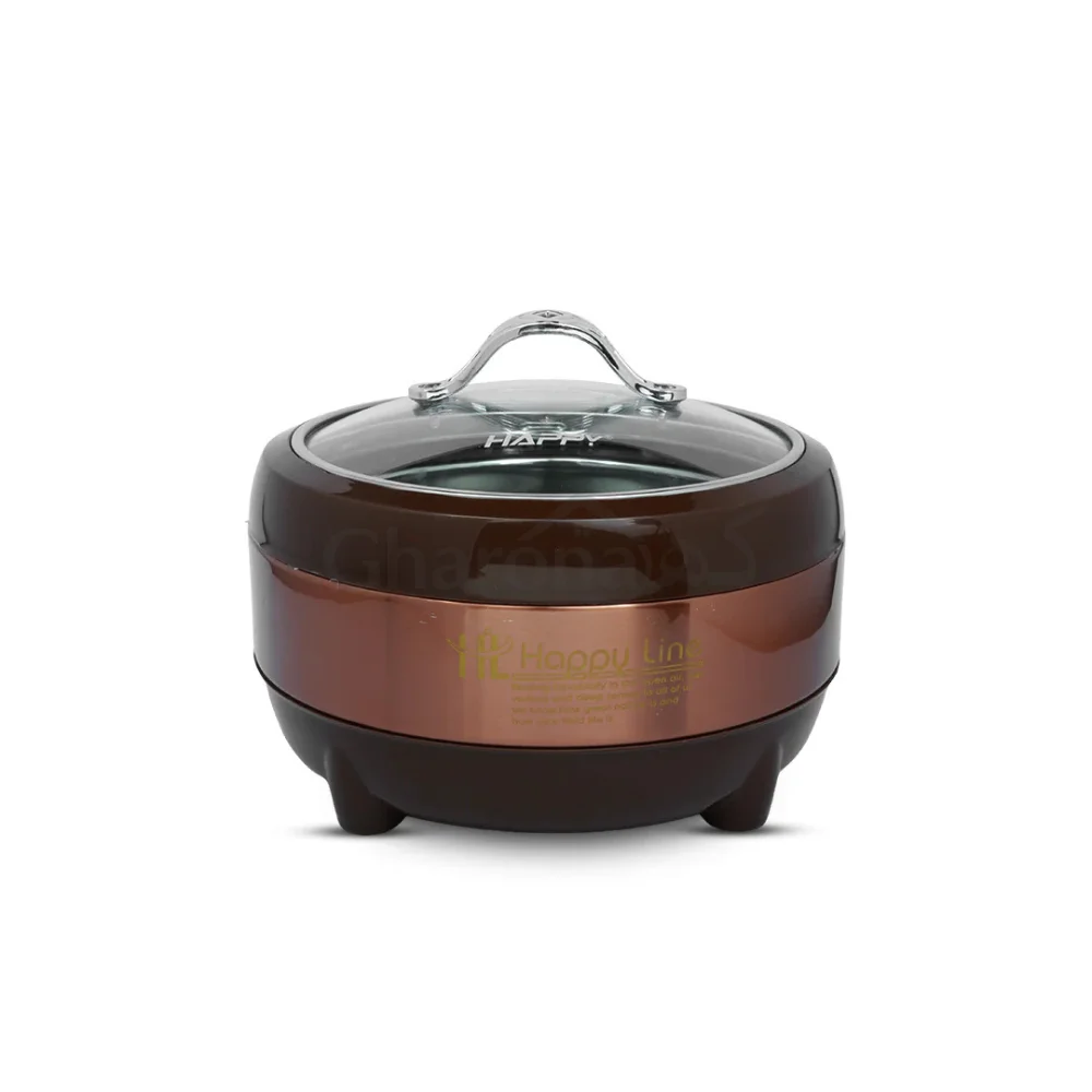 The Happy Line Metallic Brown Hotpot features premium insulation and a modern metallic finish, keeping meals warm and fresh for hours. Available at Gharona, H.526 Shahzad Plaza, College Road, Rawalpindi